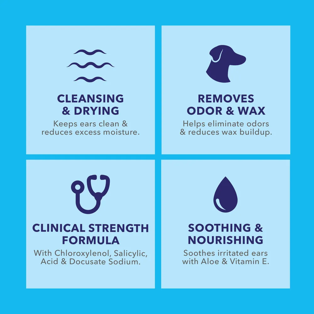 Designed by veterinarians for routine ear cleaning and odor control. Contain chloroxylenol for odor control, salicylic acid for drying and removing excess moisture, docusate sodium for the softening of ear wax, soothing aloe vera leaf juice, and nourishing vitamin E. Great for on-the-go, in-home, or anytime pets need their ears cleaned. Safe for cats and dogs.