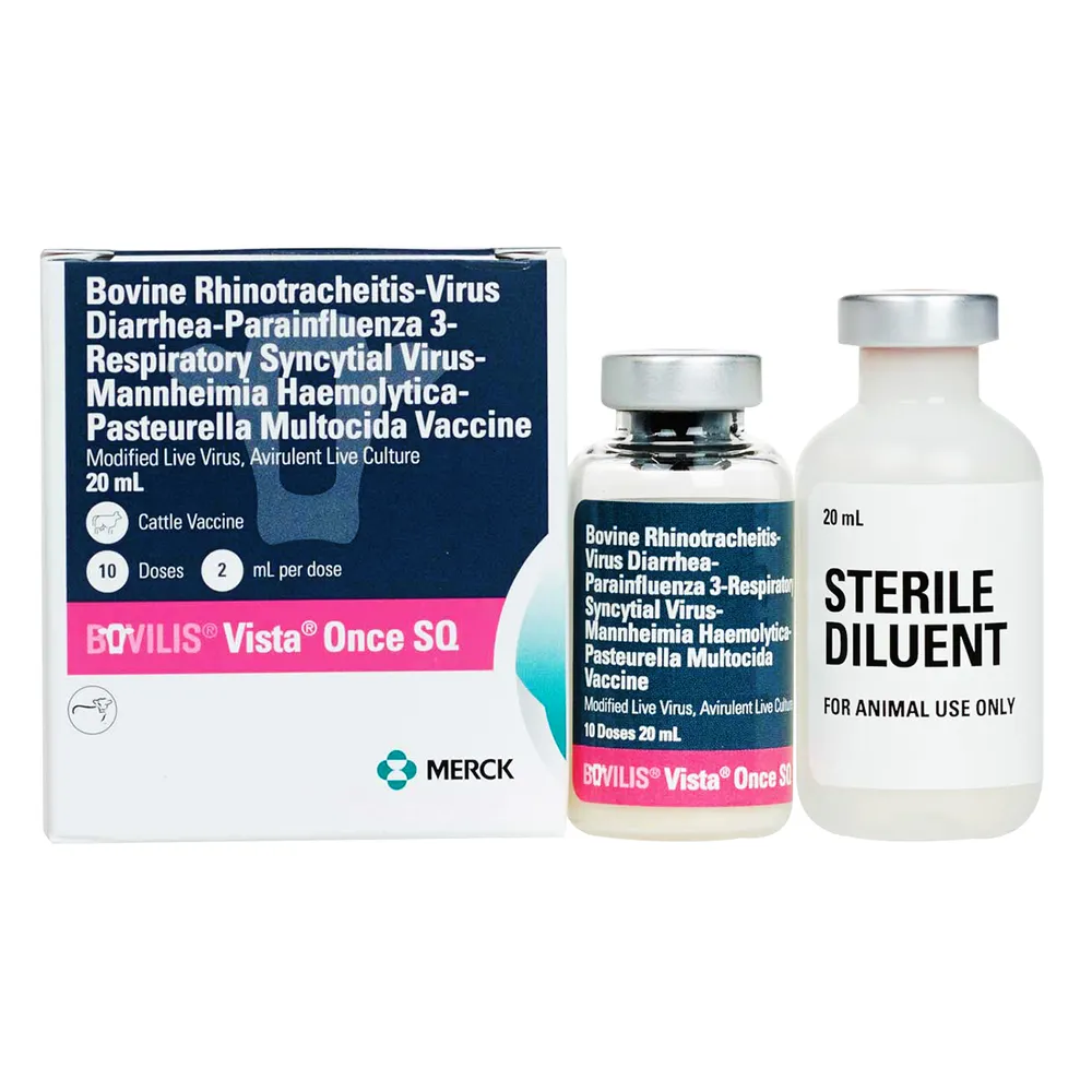 Dosage: 2 ml subcut. Revaccinate annually. Safe for use in pregnant heifers and cows or calves nursing pregnant cows provided the cows and heifers in the herd are vaccinated prior to breeding, within the previous 12 months, with any of the modified live IBR and BVD containing vaccines in this product line. Single dose! No booster required. 21 day slaughter withdrawal.
