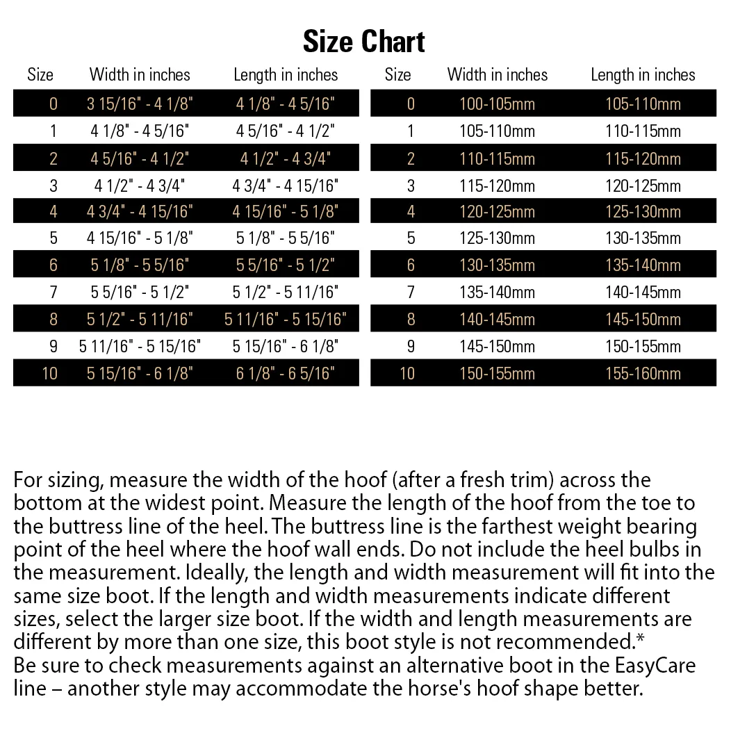 Designed specifically for the pleasure and trail rider. Quick and easy to apply, this boot requires no strength or force. Closure system keeps boots secure even in the toughest of trail conditions. Great medium distance riding boot (less than 25 miles) and ideal to carry as replacement for a lost shoe. Doubles as a therapy boot. Helps horse recover from abscesses, hoof injuries, founder, navicular disease, punctures and sole bruises. Sole shape is slightly longer than wide: an important feature that will allow more horses to wear the boots comfortably and securely. Reversible and replaceable rear safety strap. Urethane shield protects the hoof. Comfortable, lightweight and highly durable. Drainage holes built into the sole.