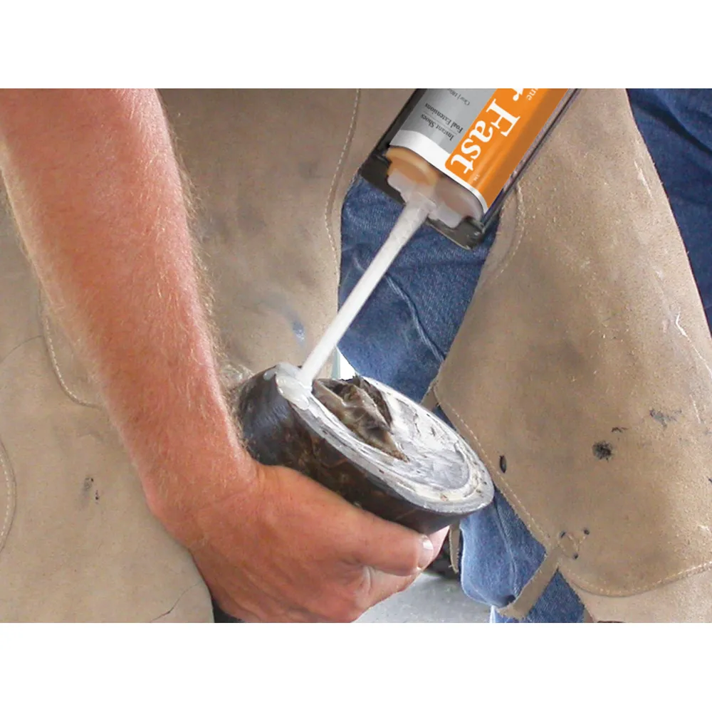 Fast-setting hoof adhesive for foal extensions and custom shoes. Great for building heels, correcting heel angles, medical/lateral extensions, and for small hoof repairs.