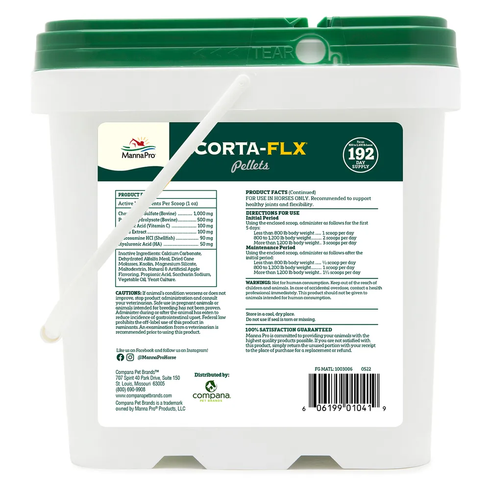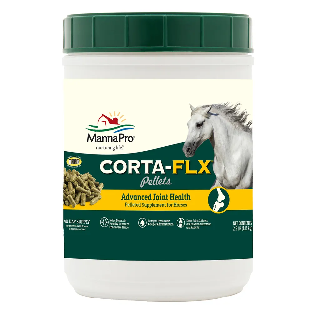 Contains a combination of the isolated amino acids that make up both chondroitin and glucosamine, plus 50 mg/oz hyaluronic acid. Pellets and powder contain 2% crude protein, 0.10% crude fat and 24% crude fiber. Pellets are sprayed with Corta-Flx Solution to deliver the results of a liquid in an easy-to-feed pellet.