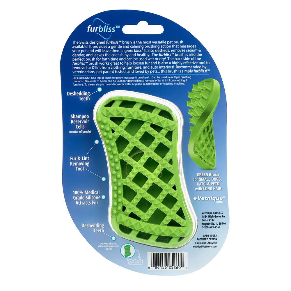 100% medical-grade silicone brush desheds, removes sebum and dander, and leaves coat shiny and healthy. Back side of brush works well to help loosen hair from pet. Also a highly effective tool to remove fur and lint from clothing, furniture and auto interiors. Provides comforting and relaxing massage while stimulating circulation of skin, joints and muscles. Great for use all over the body, including sensitive and smaller areas such as the face, neck, ears and legs. Can be used with shampoos to create a luxurious lather for deeper cleaning during bath time.
