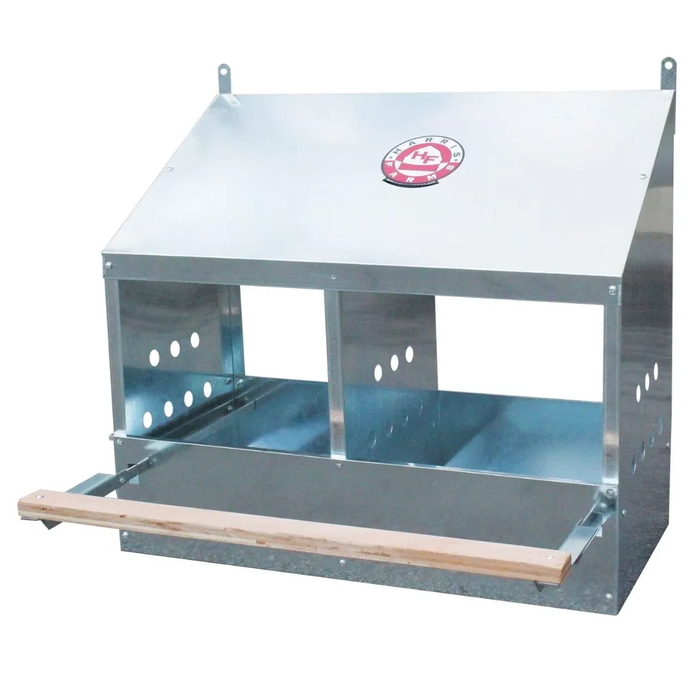 Rust-resistance galvanized steel double nesting box features ventilation holes, hinged wooden perch, and folded edges. Bottom metal inserts are removeable for easy cleaning.
