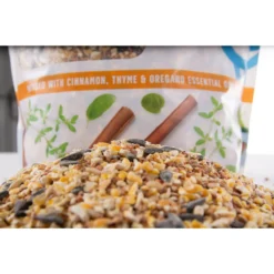 Contain oregano essential oils, cinnamon and thyme essential oils, prebiotics, multi-grains, cracked corn and sunflower seed. Â