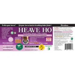 Directions: First time users – Mix 1 scoop (2 Tbsp) in morning feed and 1 scoop in evening feed for 7 days in a row, then switch to regular schedule. Regular schedule – Mix 1 scoop (2 Tbsp) daily in morning feed. Most horses respond in 10-14 days with improved respiratory rates, less cough and calmer attitudes from being able to breathe better. Due to lemon balm and green tea (low level caffeine), withdraw HEAVE HO 3 days prior to competition. Do not compete at tested events when using HEAVE HO. Measuring scoop included.Â