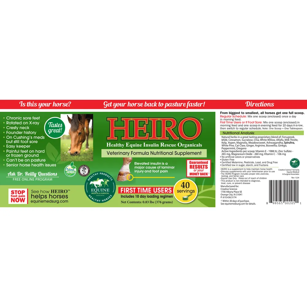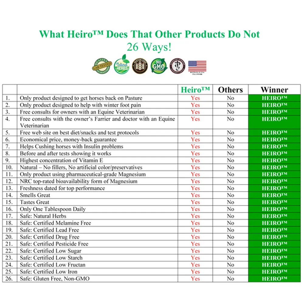 All-natural HEIRO was developed by Dr. Frank Reilly, DVM, to help the rapidly growing number of horses suffering from chronic sore feet with high insulin levels. From spring’s new grass and summer’s heat to the frosty grass and frozen ground of winter, seasonal factors can cause serious laminar injury and chronic foot pain. Fortunately, after two years and hundreds of insulin tests, Dr. Reilly discovered the right combination and concentration of organicals to help improve insulin control and get your horse back on the pasture where they were born to graze and play. No more dirt lot. Get your horse back to grass pasture faster with HEIRO. Try risk-free today!