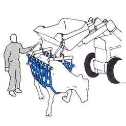 Easy-to-use sling aids in getting animal up on its feet, regaining proper circulation, eating and drinking habits, and restoring normal bodily functions sooner. Monitor for 2-3 hours; do not keep in sling for longer than 12 hours. Large size sling for downer cows, birth paralysis, milk fever, strained muscles and trimming feet. Lightweight; made with strong zinc-plated pipe and durable polypropylene strap-webbing. Use with tractor bucket or cable pullers (included) on a secure beam.